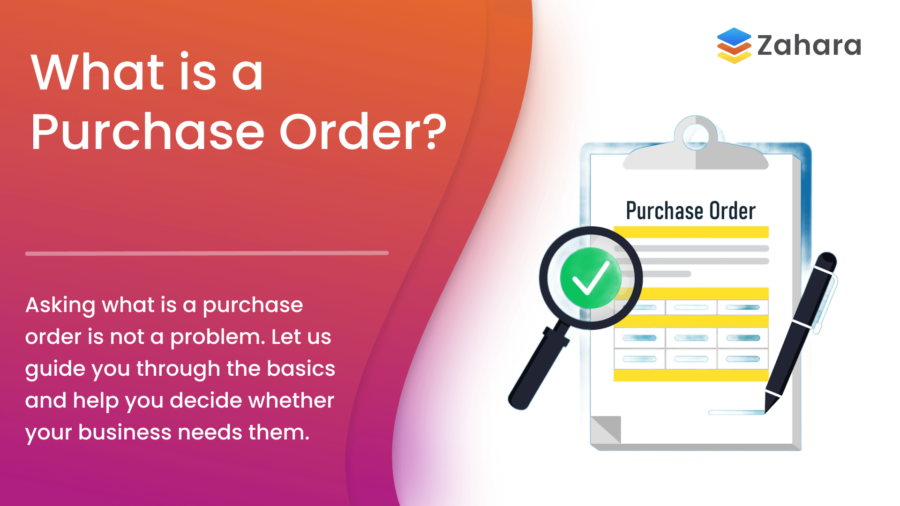 Graphic explaining purchase orders, featuring a clipboard with a purchase order form, a magnifying glass with a check mark, and text introducing what is a purchase order ? basics for businesses.